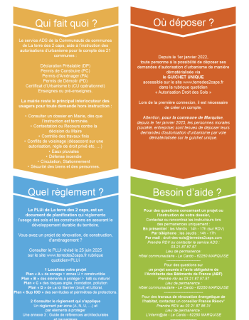 Depuis 2015, le service mutualisé d’aide à l’instruction des Autorisations du Droit des Sols (ADS) assure l’instruction des autorisations d’urbanisme en étroite collaboration avec les 21 communes du territoire de La terre des 2 caps.