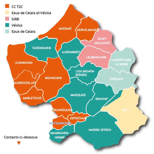 - en DSP à Véolia pour les communes de Audembert, Leulinghen-Bernes, Maninghen-Henne, Marquise, Réty (partiellement), Rinxent, Tardinghen, Wierre-Effroy.
