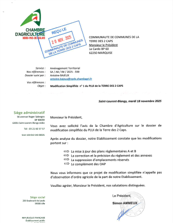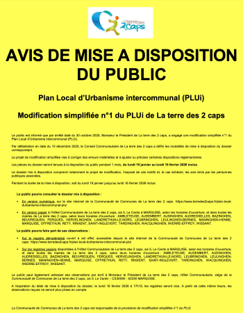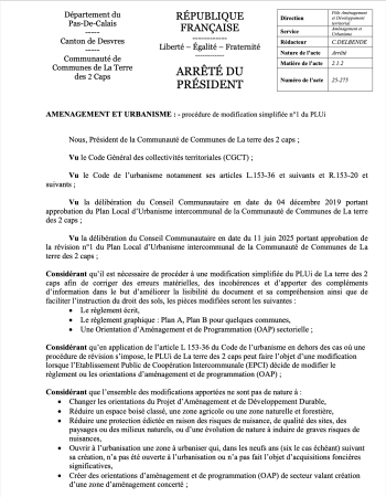 Une nouvelle évolution du PLUi a d'ores et déjà été engagée. Par arrêté du 30 octobre 2025, le Président de la Communauté de communes de La terre des 2 caps a engagé une procédure de modification simplifiée.
